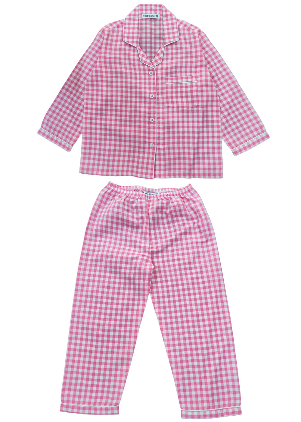Pink Checkered Print Long Sleeve Kids Night Suit
