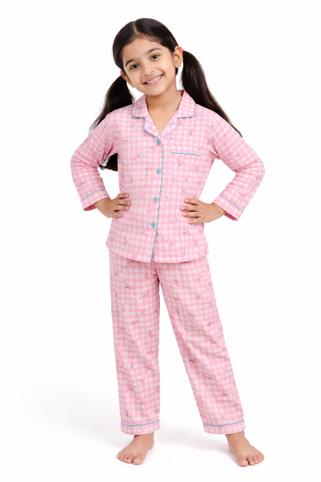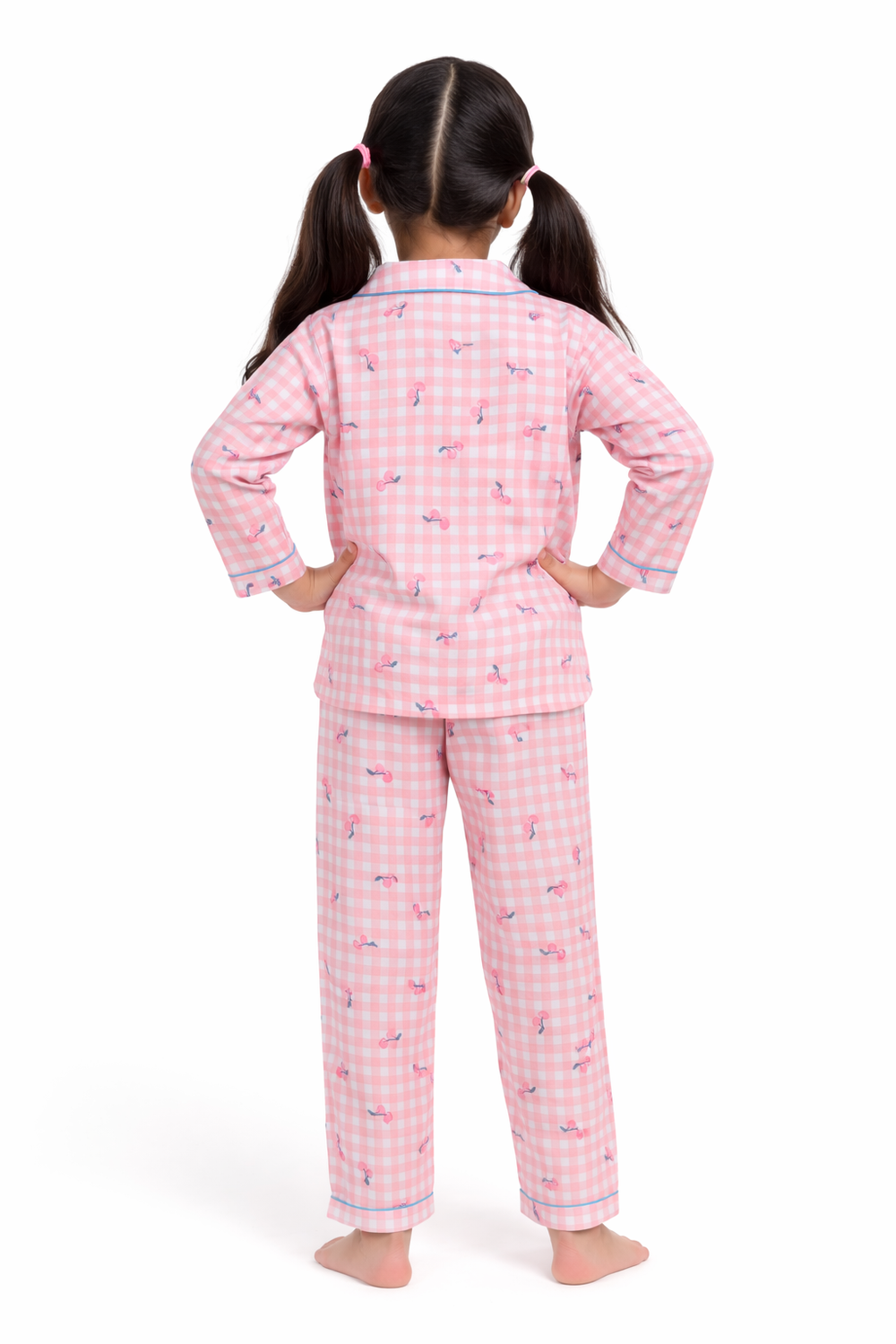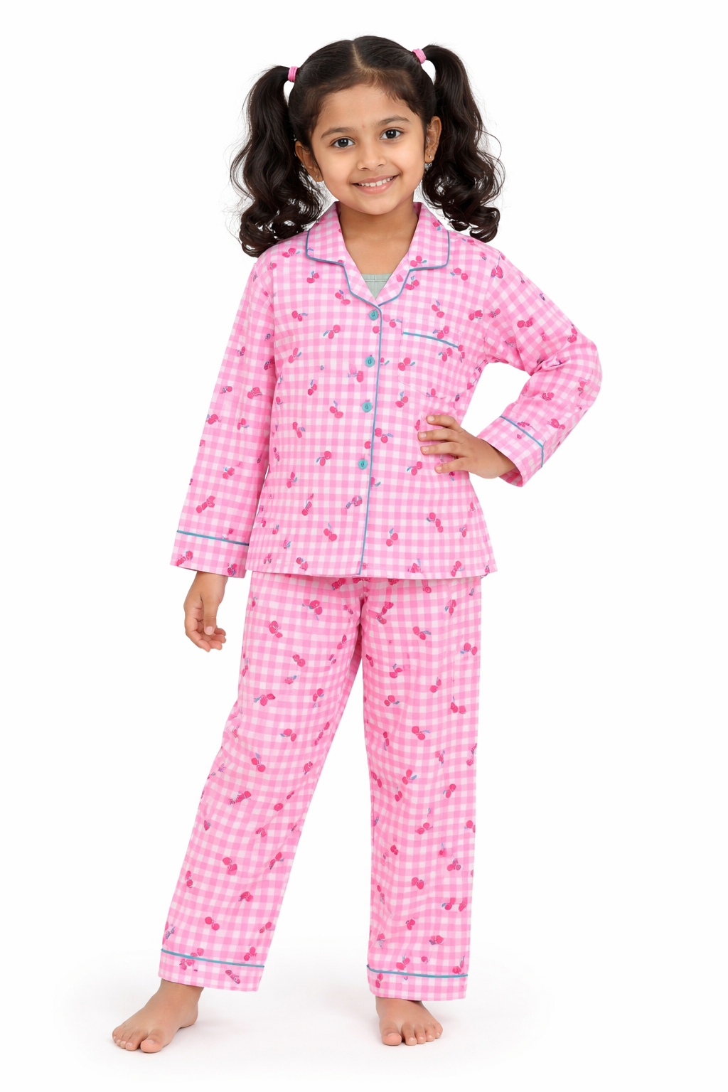 Pink Cherry and Checks Print Long Sleeve Kids Night Suit
