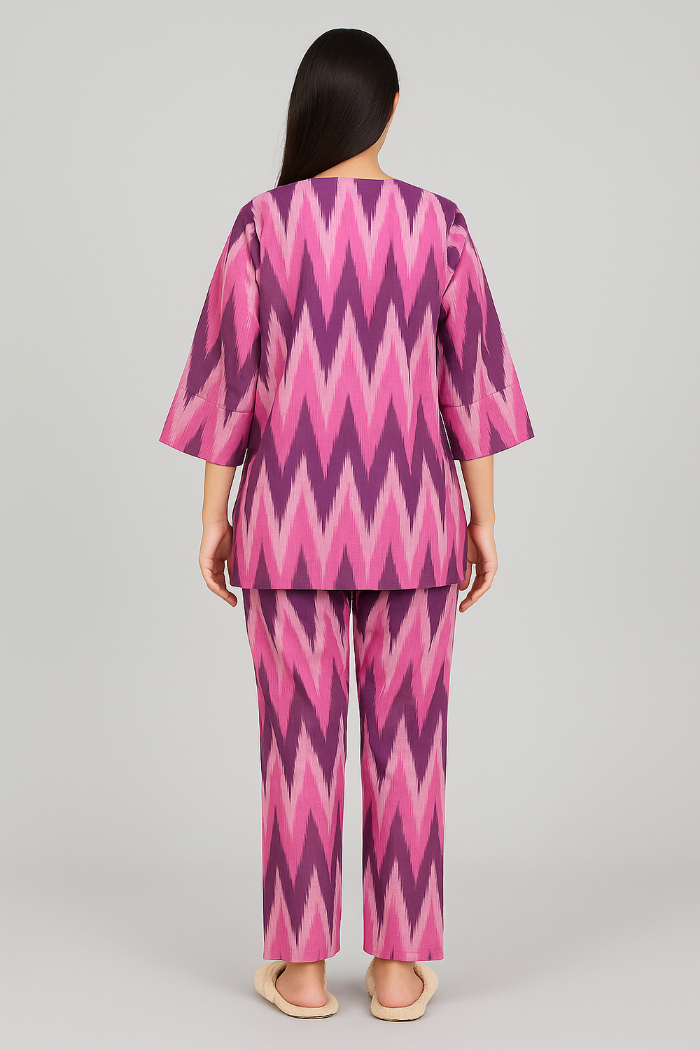 Pink Ikat Print V Neck 3/4Th Sleeve Women's Night Suit