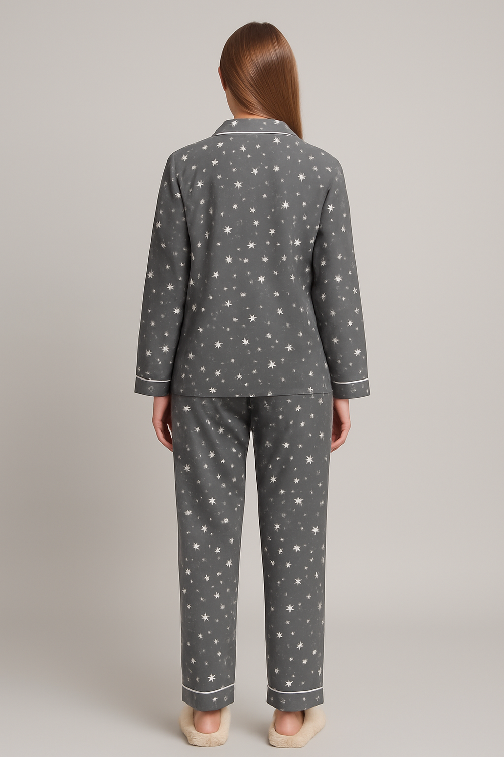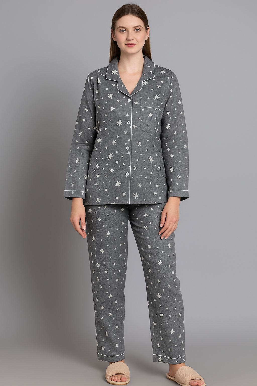 Grey Starry Nights Cotton Flannel Long Sleeve Women's Night Suit