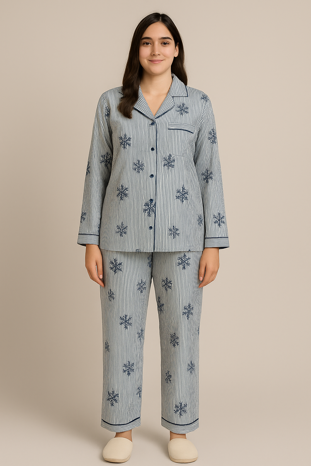Snowflake and Stripe Cotton Flannel Long Sleeve Women's Night Suit