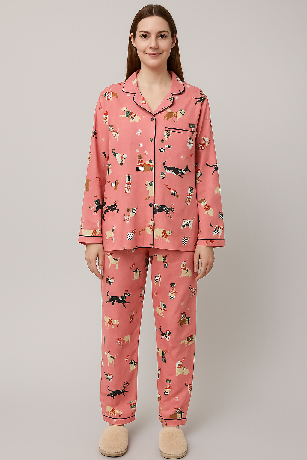 Pink Dogs Print Cotton Flannel Long Sleeve Women's Night Suit