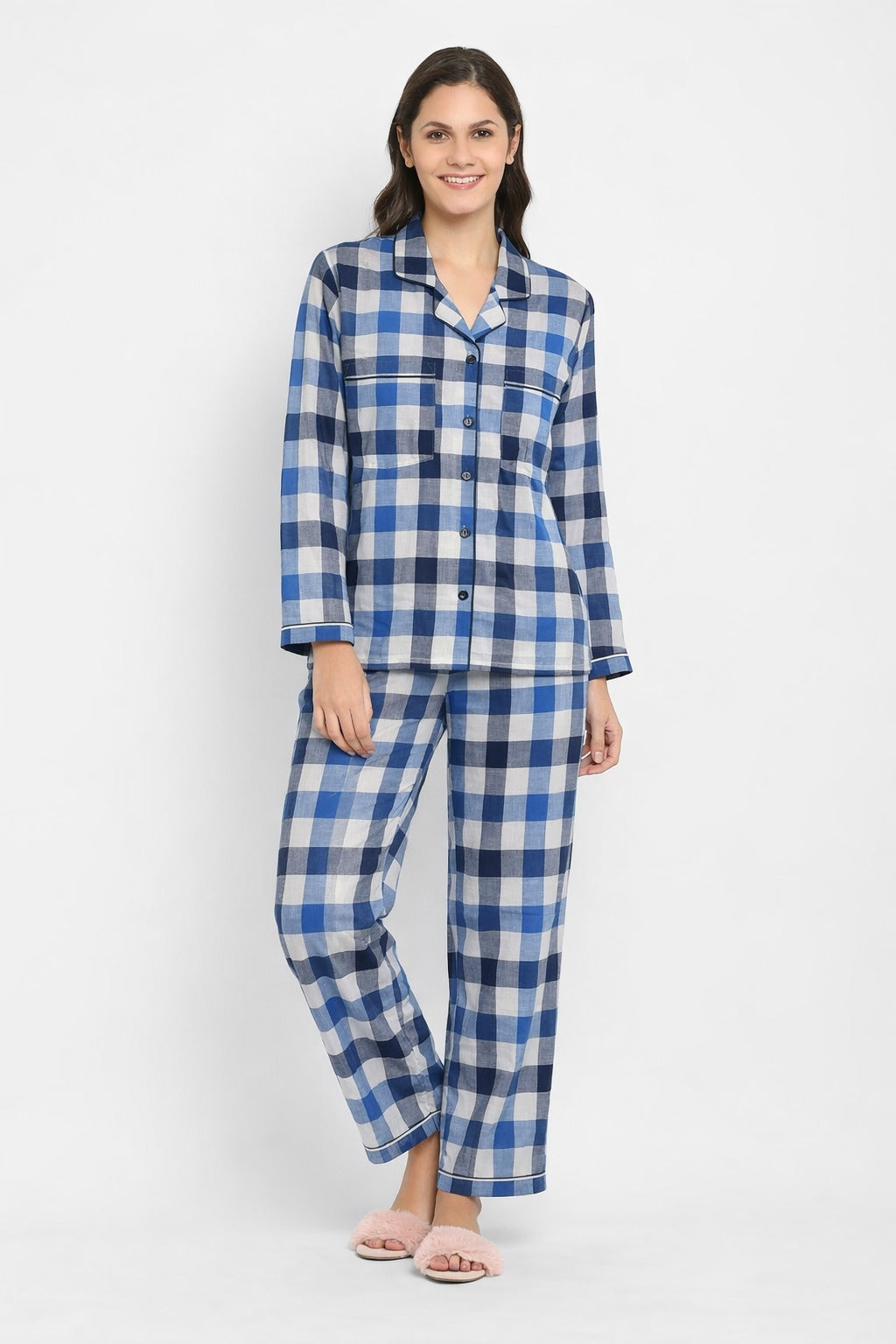 Blue Gingham Print Long Sleeve Women's Night Suit
