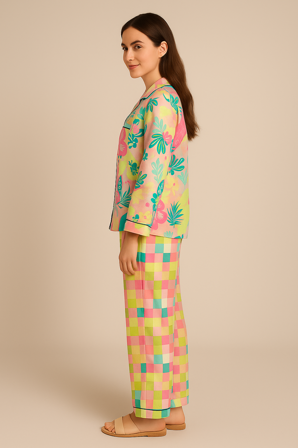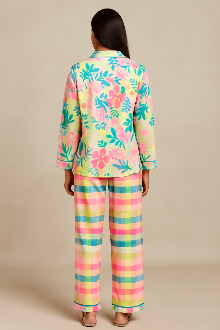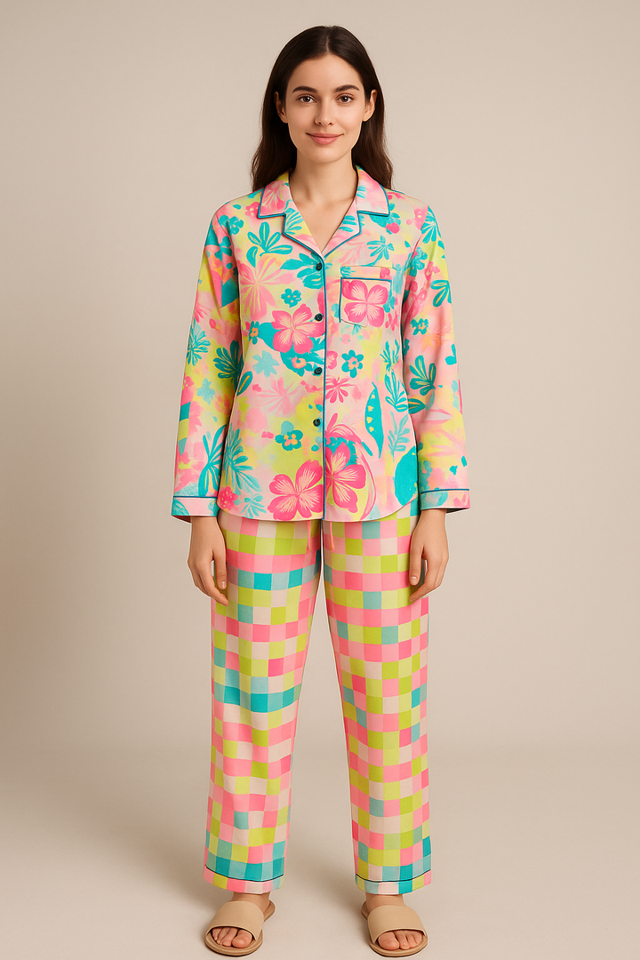 Floral Checks Print Long Sleeve Women's Night Suit