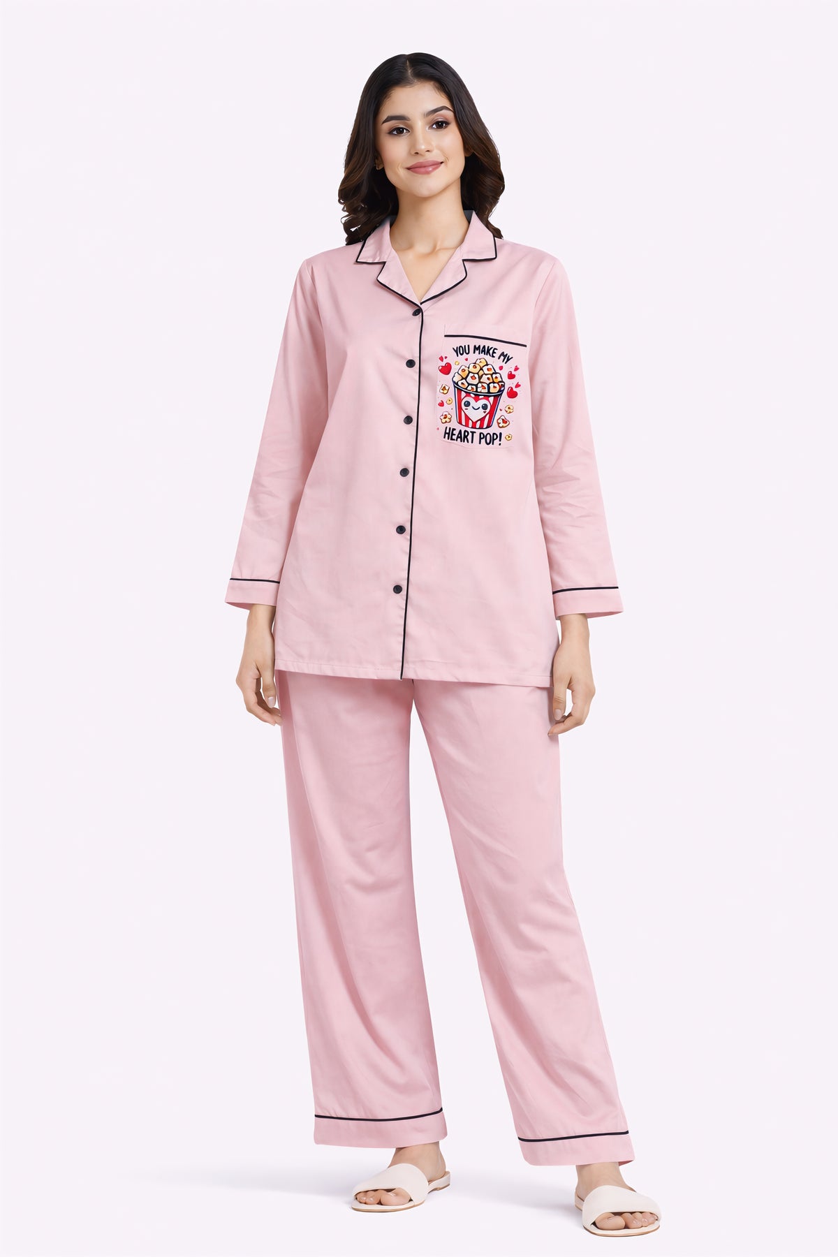 Heart Pop Pink Print Long Sleeve Women's Night Suit