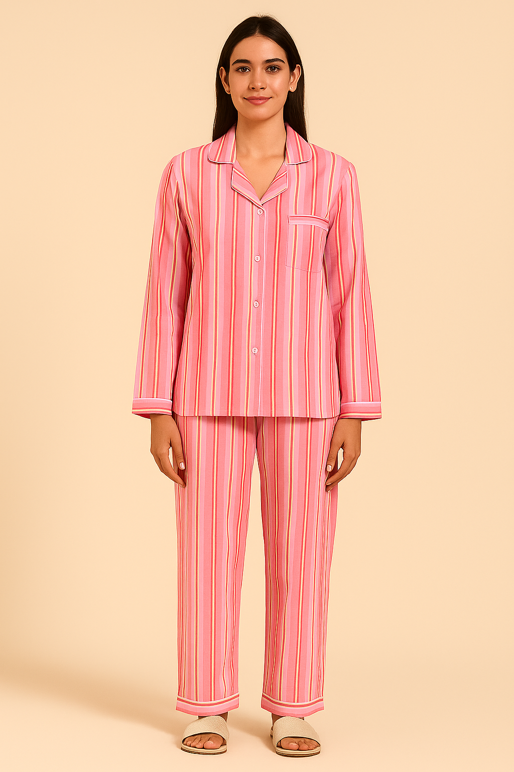 Pink Bold Stripes Print Long Sleeve Women's Night Suit